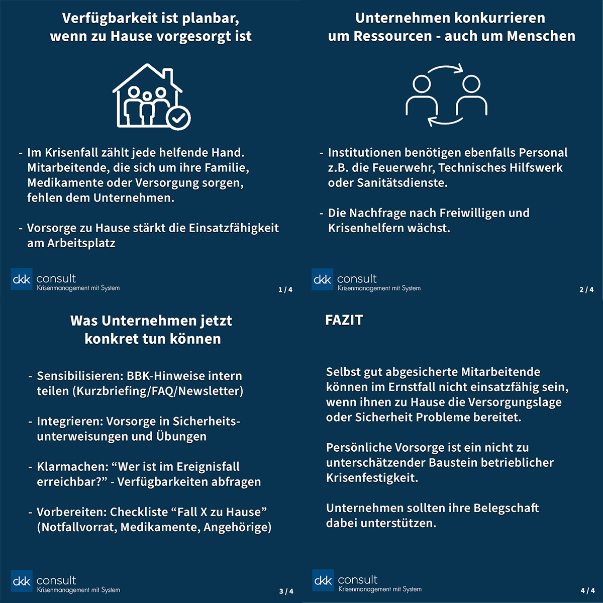 Im Ernstfall konkurrieren Unternehmen um Ressourcen: nicht nur um Material, sondern auch um Menschen. Wer zu Hause nicht abgesichert ist, fehlt im Ereignisfall im Betrieb.